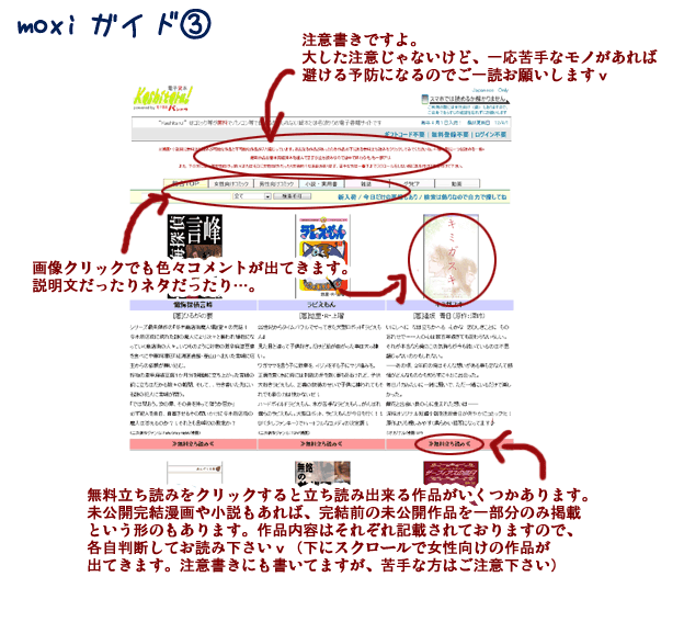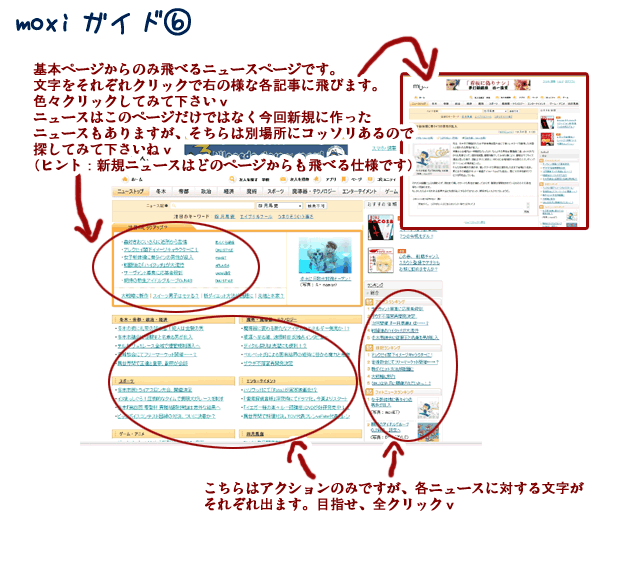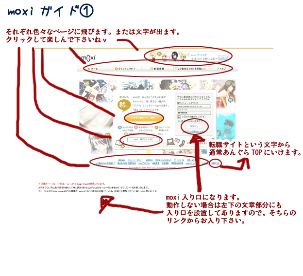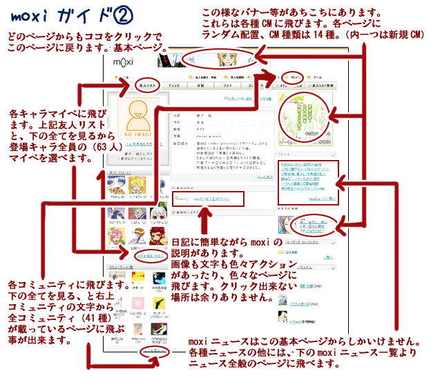 ですが基本である事には間違いないので、移動に迷ったらCM以外のページからは、とりあえずどのページでも左上のmoxiという文字をクリックすればこのページに戻れますのでそこからまた移動をして頂ければと思いますv(CMページ等はmoxiに戻るというリンクが貼ってありますのでそちらをご利用になるかブラウザバックをご利用下さい)